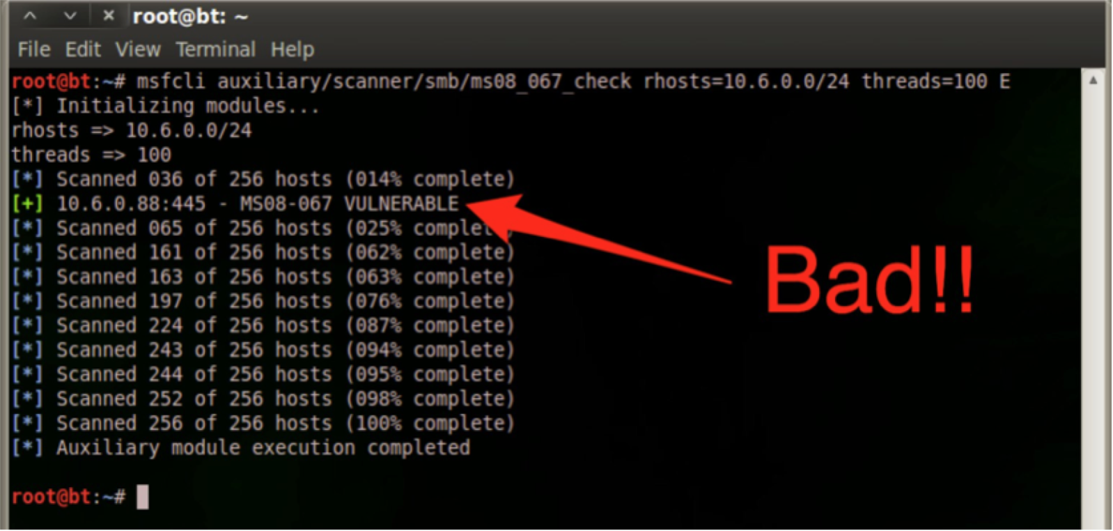 So now it is currently possible to use the module auxiliary/scanner/smb/ms08_067_check to scan for vulnerable instances of ms08_067 safely without fear of knocking over the service. The Nmap comparable way to run this check on the command line would be to use Metasploit's command-line interface msfcli. The following command is all that need be run to identify vulnerable systems: