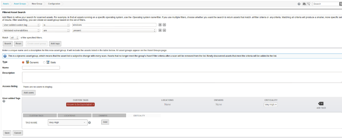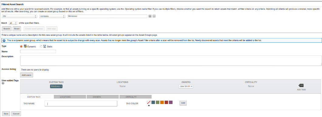 In the above screenshot, I have searched for all assets in my organization that have an Operating System of Windows. I want to be able to automatically classify those assets with a Windows tag and I know that "Jane Smith" is responsible for remediation for all Windows assets. By adding these tags, when looking at any asset that is Windows, I can easily gain the context I need to understand what to do when I need to tackle this asset. I will no longer have to spend time figuring out what an asset is, when the system can help me auto-populate what I need to know. The power of dynamic asset groups allows me to group information in the way that I want to see, and then apply the logic that I need to help my organization drive value and lower security risk.