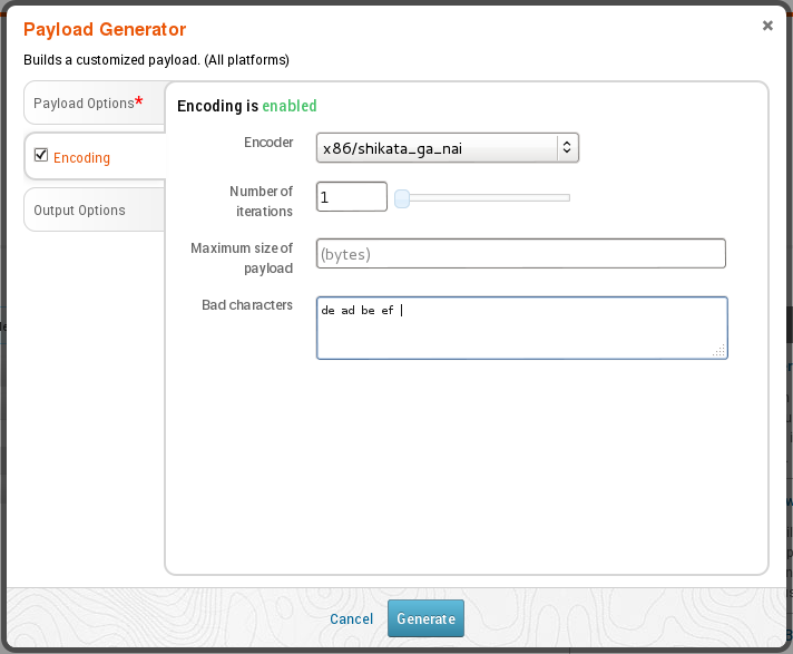 Encoding the payload is easy, too. Simply type in the characters you'd like to see excluded from the payload.