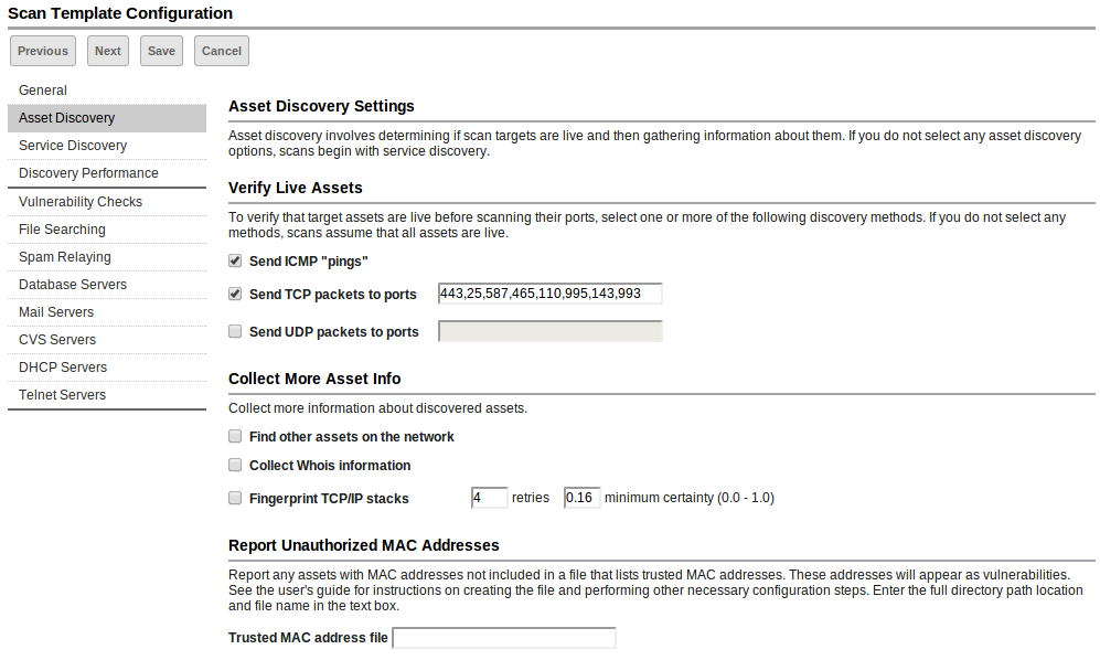 Click Next to go to the Asset Discovery section. Check Send ICMP “pings” and Send TCP packets to ports. Enter any TCP ports that may be running SSL on your network.