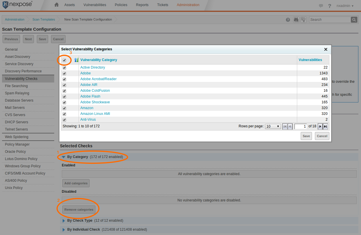 To adjust the template so it targets only the checks relevant to Heartbleed, first click on the Vulnerability Checks link at the left. Then click the By Category link under "Selected Checks." Under Disabled click the Remove categories button and select all the categories by clicking the checkbox in the table header. Click Save. At this point no vulnerability checks are enabled, and you have a blank slate to add specific checks to the template.