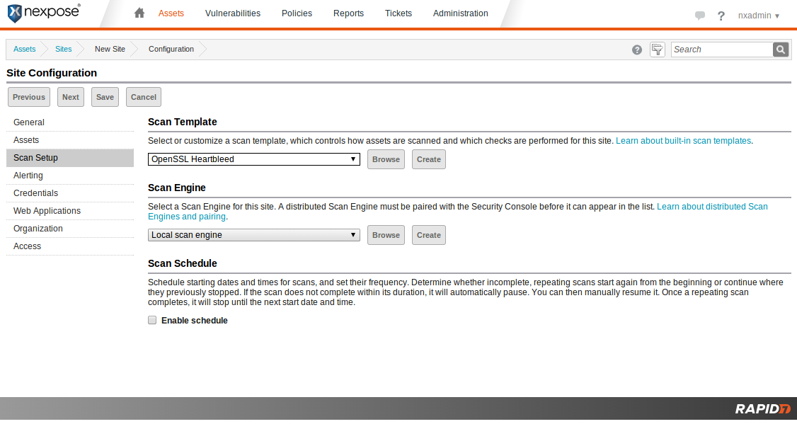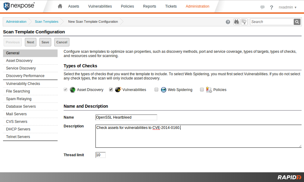 Scanning your assets with the regular full audit template, or indeed any template that isn't tuned to exclude many ports or vulnerabilities, will automatically pick up this vulnerability. But it is also possible to create a focused template to scan specifically for Heartbleed.