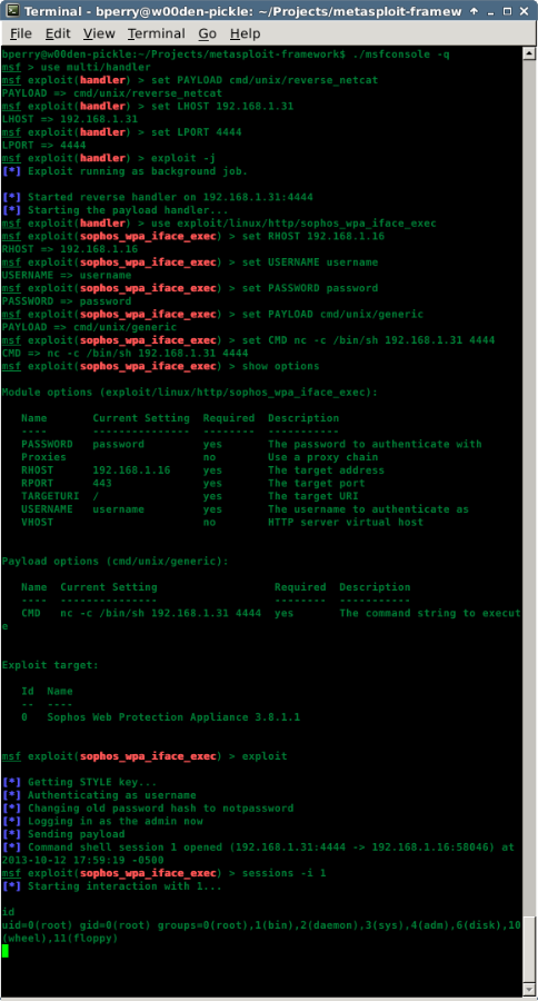 This Metasploit module exploits both vulnerabilities in order to go from an otherwise unprivileged authenticated user to root on the box. This is particularly bad because this appliance is what sits between the internet and a company's intranet, filtering all the HTTP traffic.