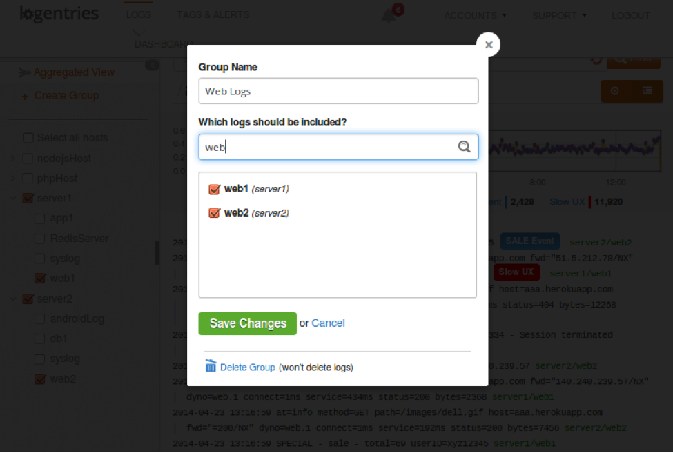 You can now simply select a series of logs from the Aggregation View and press the Create Group button to create a group. This allows you to quickly view different series of logs in quick succession. You can also save that setting and easily return to that custom view again. When you decide you want to add additional logs to that Group, simply search for them and select from the list as seen below.