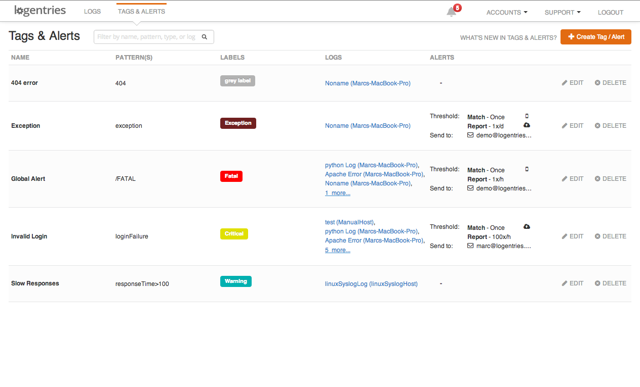 With the le_java library, you can easily put any log data you want into the logging methods argument as any valid string. You can concatenate one or more variables’ names and values which can subsequently be used for searches, tags, and alerts in the Logentries web app. You choose what data and events in your application are important to you and it will be logged in the format you prefer and sent directly to your Logentries account. Once there, it is always available for analysis in future, and you can easily build real-time alerting on top of these for immediate notification based on events or activities.