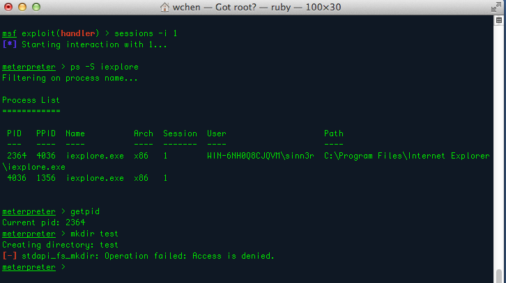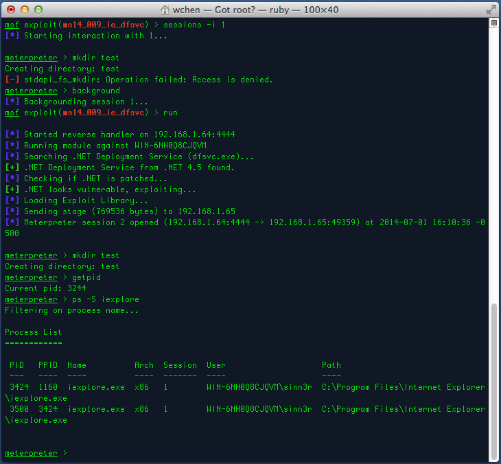 As you can see, my meterpreter shell can't even create a directory under process iexplore.exe due to low privileges, so we're going to have to escalate. Let's pick exploit/windows/local/ms14_009_ie_dfsvc as an example, which is used the way you would with pretty much any other local privilege escalation modules: