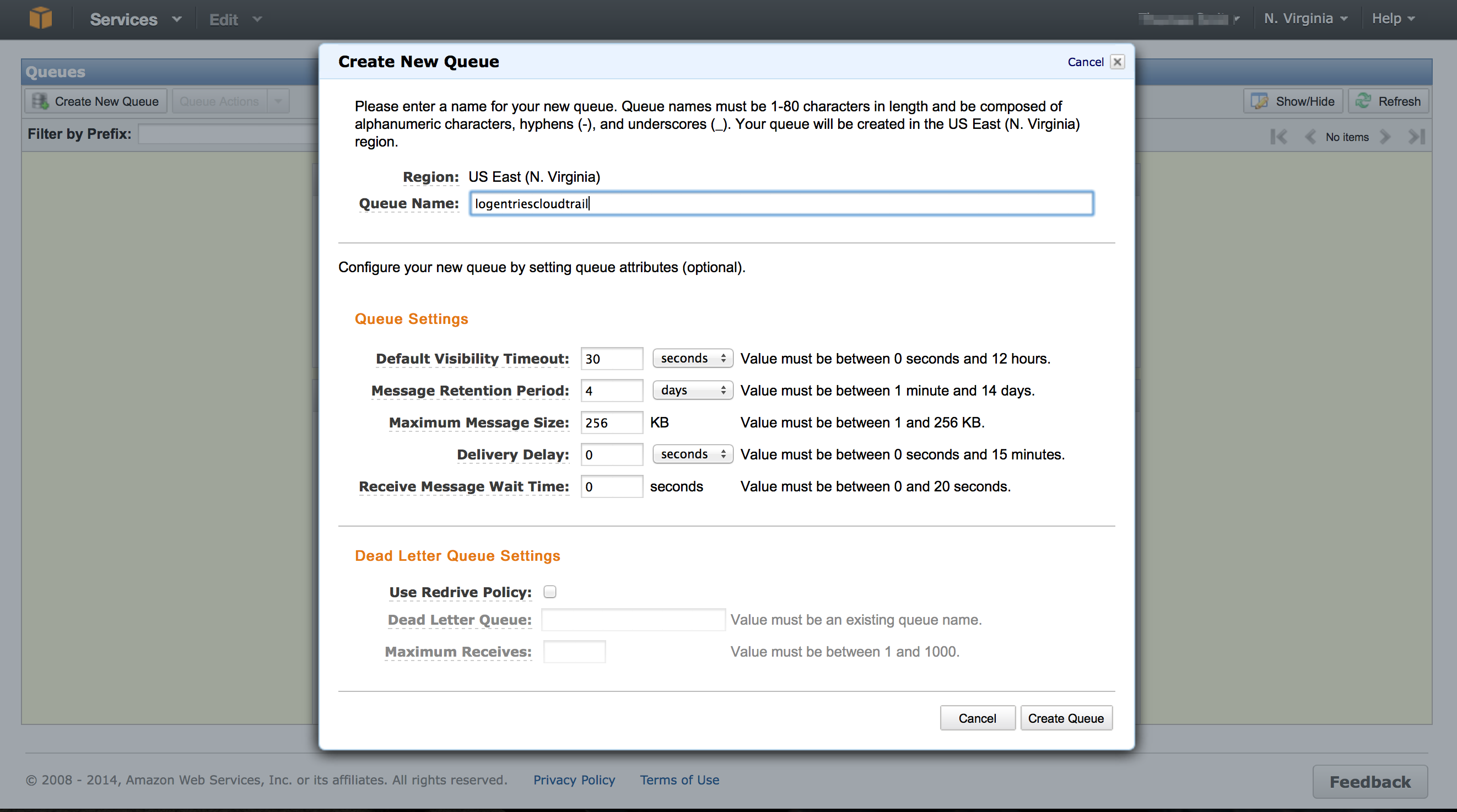 Next up, we need to create an SQS Queue to allow Logentries to consume your CloudTrail data. Create a new Queue and provide a ‘Queue Name’ – default options are fine.