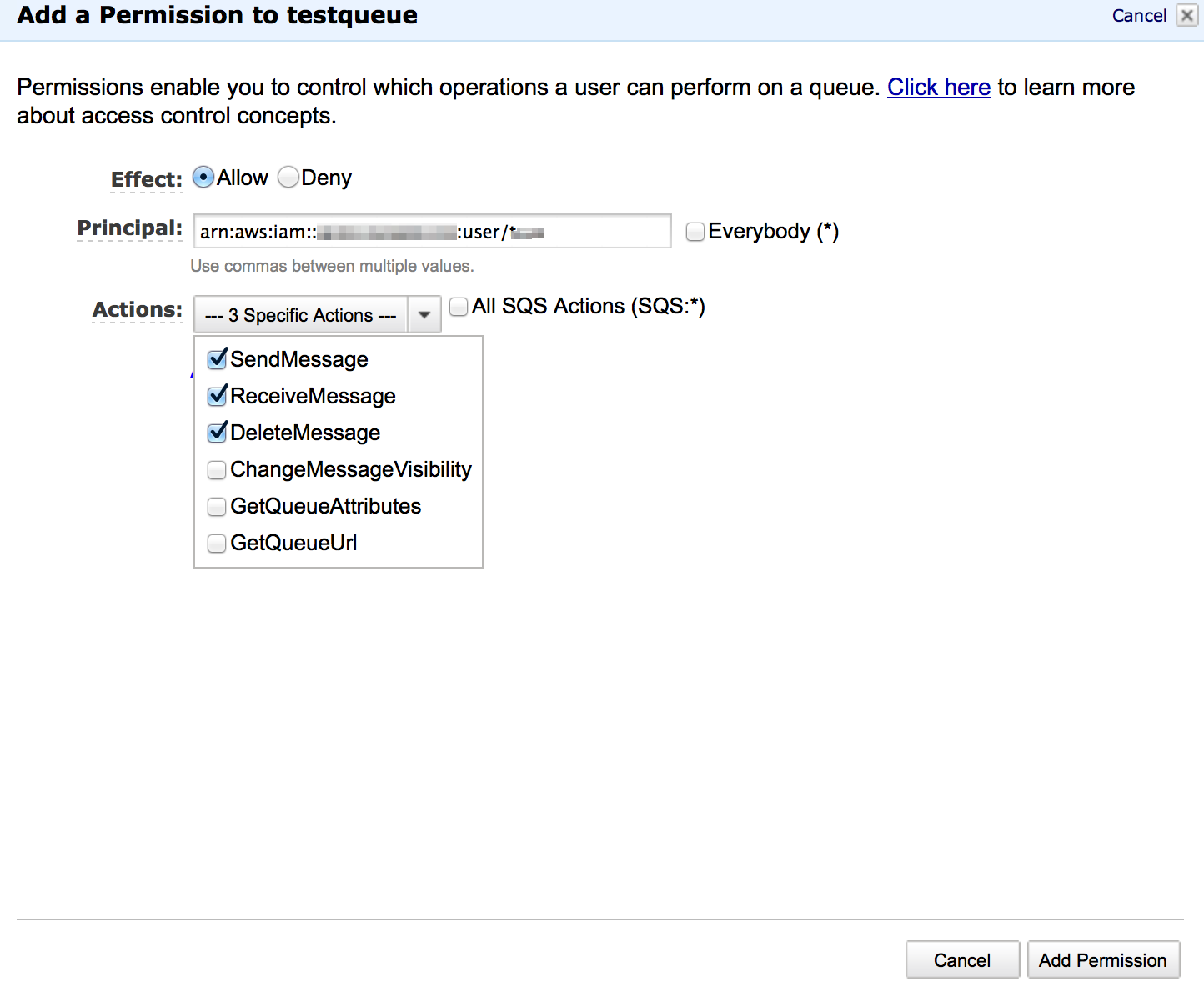 Once the queue has been created, the correct permissions must be applied. When adding permissions to the SQS queue, you need to add your full account number/name (officially called the AWS User ARN).