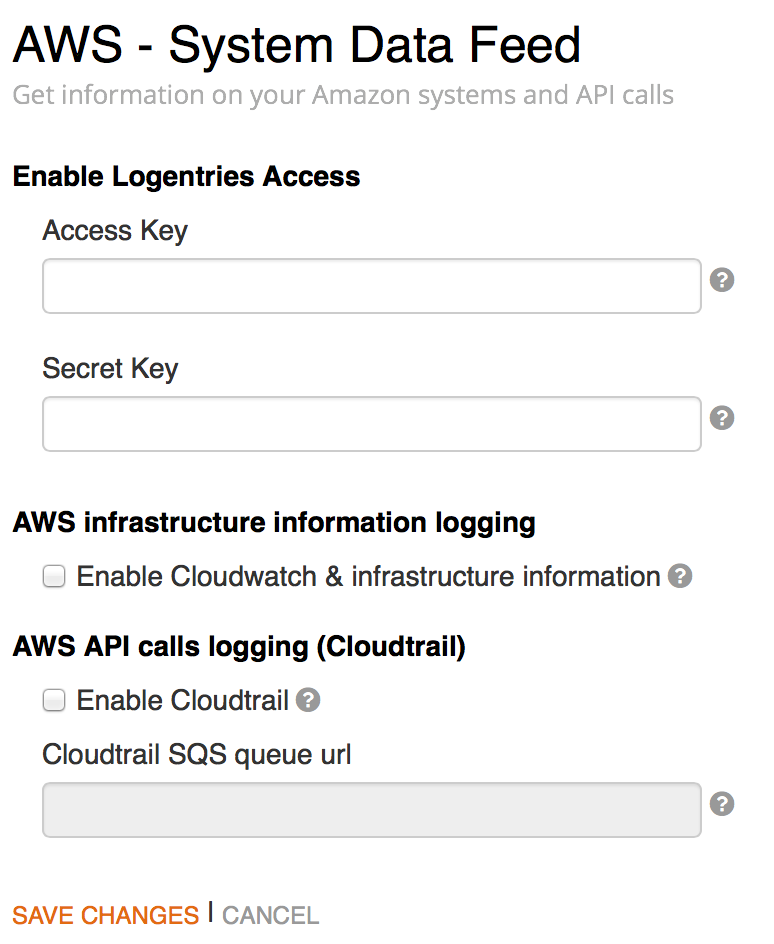 Login to your Logentries account and navigate to your AWS settings area (My Account -> AWS). Select enable CloudTrail, supply your IAM access key, secret key, and SQS URL that you have copied above. Hit Save! Note: your IAM access key and secret key are made available to your when you create a new IAM user and should be stored safely.