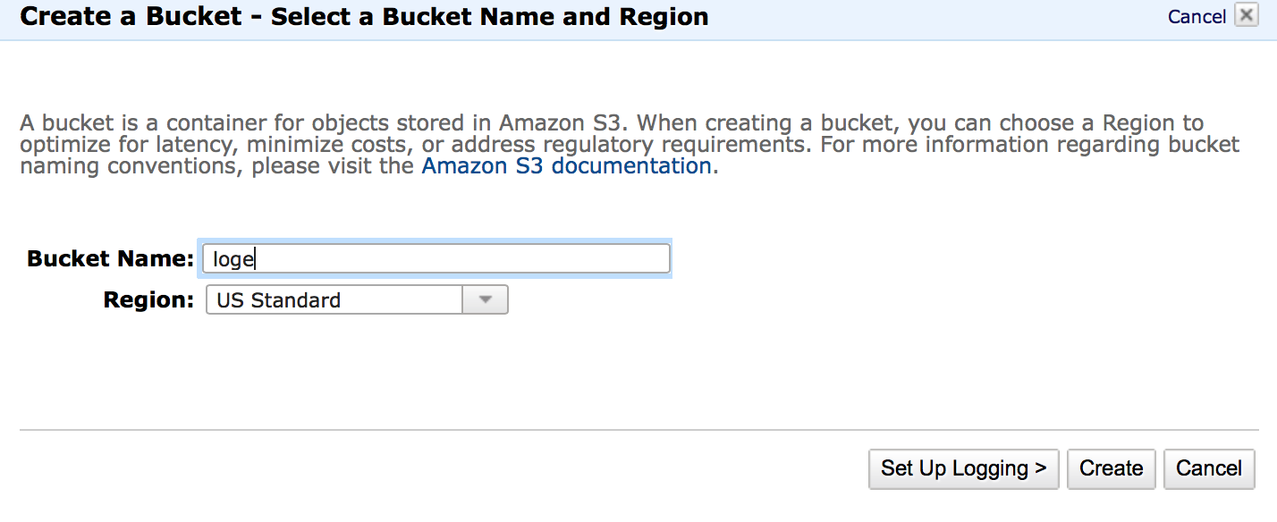 If you’re new to the CloudTrail setup, the first requirement of CloudTrail logging is that the logs must go “somewhere.” In AWS, this somewhere happens to be a S3 bucket which you should create. Simply navigate to the S3 service and select ‘Create Bucket’. By default, all permissions required are given to the bucket – i.e. there is no extra permissions/configuration necessary to configure CloudTrail logging with Logentries.