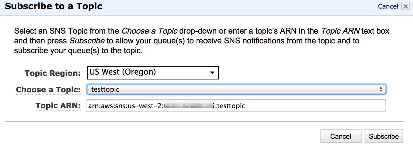 Once each region has been setup, the last step in AWS is to subscribe your SQS Queue to each newly created SNS topic. Navigate to the SQS Service in your AWS Console and highlight the queue created in step 2 above. Under the ‘Queue Actions’ menu at the top select ‘Subscribe Queue to SNS Topic’. Use the ‘Topic Region’ drop down to select the region and the ‘Choose a Topic’ drop down to select the topic created in the previous step. Hit the ‘Subscribe’ button and wait for the confirmation that the queue has subscribed to that topic.