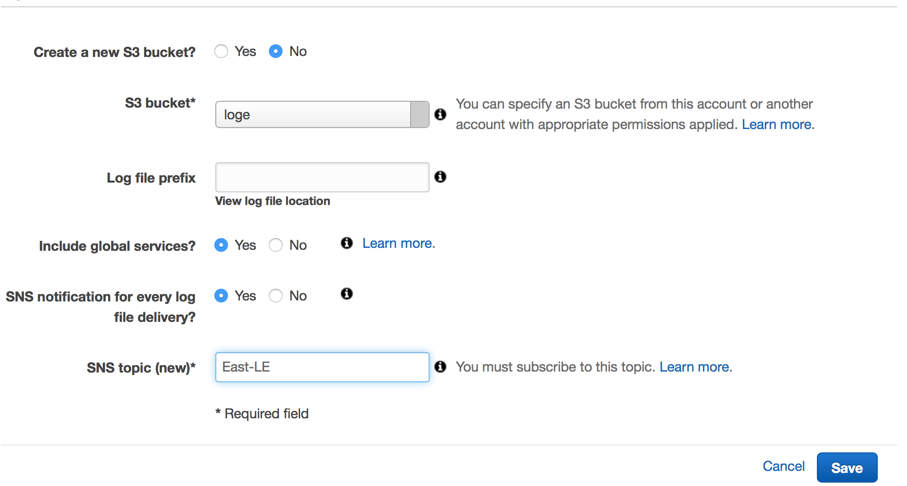 Follow these above steps for each region that you want to collect CloudTrail logs from. NOTE: when adding subsequent regions you will want to exclude Global Services to avoid duplicate log events being recorded for your Global Services.