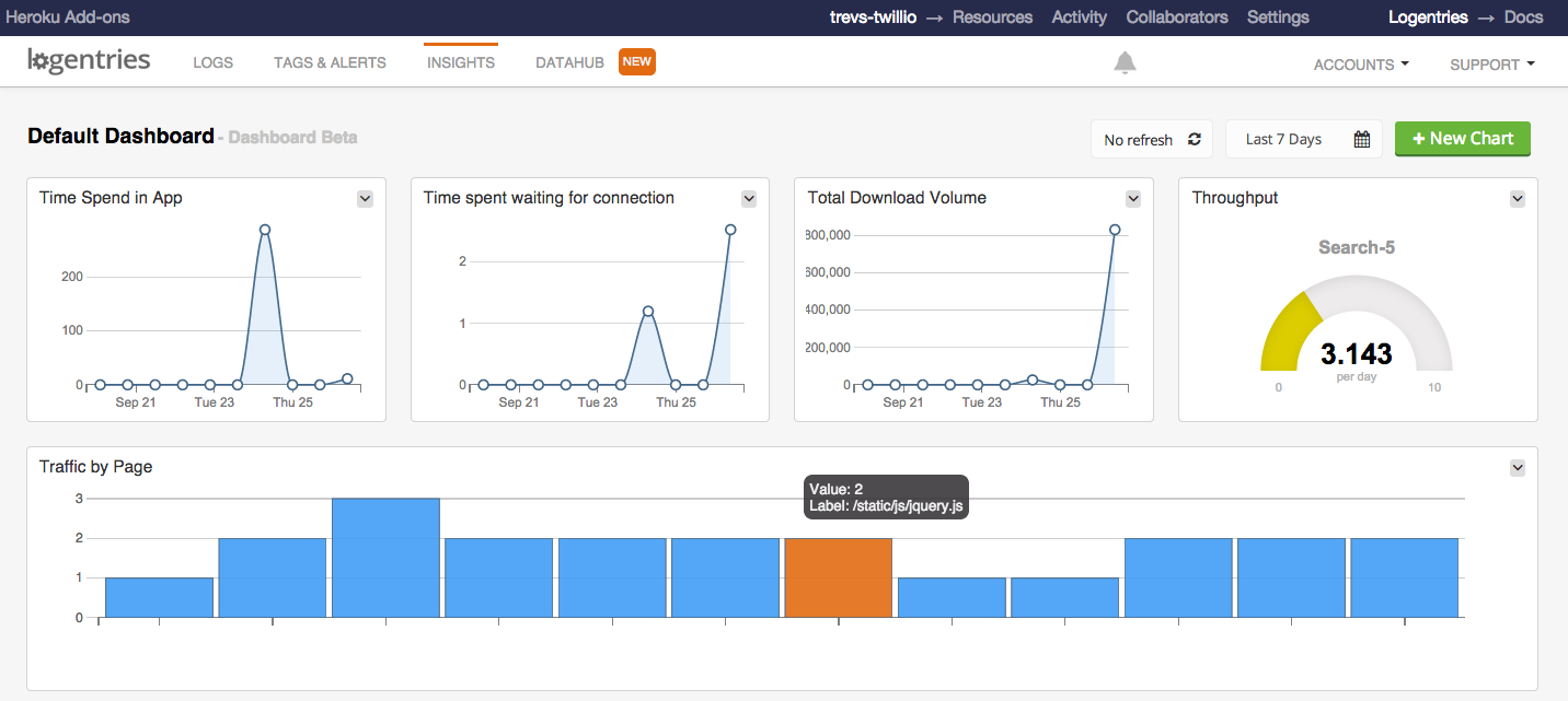 10 mins later I had deployed 2 Heroku add ons (naturally one of these was Logentries – the other was New Relic as I also wanted to check out our new integration) and was looking under the hood of my new apps checking out exactly what was going on. I was building graphs, had created some nice visualizations … after 15 mins… my level of excitement was starting to worry my co-workers….
