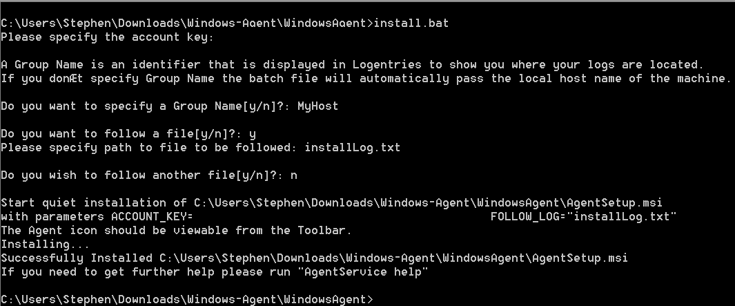 Users can simply run the install.bat without any parameters. In this mode we will guide you on setting up your Windows Agent. This interactive install exposes you to the features of the Agent and Logentries such what a Group/HostName, how to follow your Environments Systems Stats and how to get help when you are stuck on the command line.