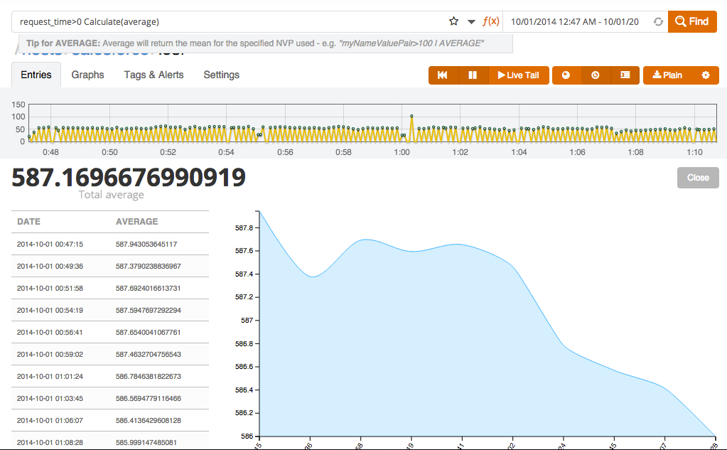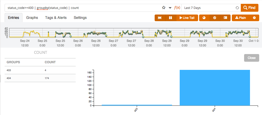 When log events in these formats are sent to Logentries, the query language makes it easy to generate graphs for the KVPs. For instance, Figures 1 and 2 respectively show the distribution of status codes higher than 400 over time, and the average request time of requests processed by an Nginx server.