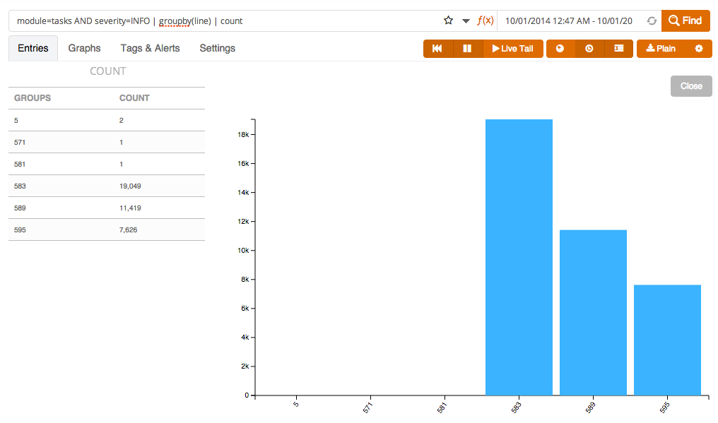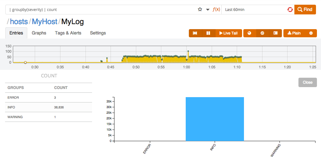 This example quickly shows that the process that was logged mostly performed OK during the selected time range. Users can go to the log view within Logentries to get details on the log event with ERROR or WARNING severity. Figure 3 also indicates that a substantial amount of log events with INFO severity have been logged.