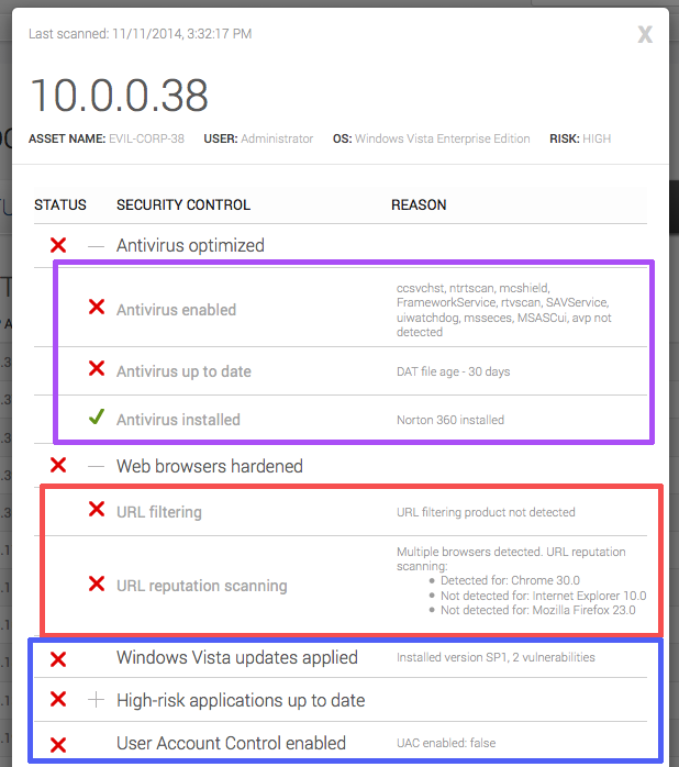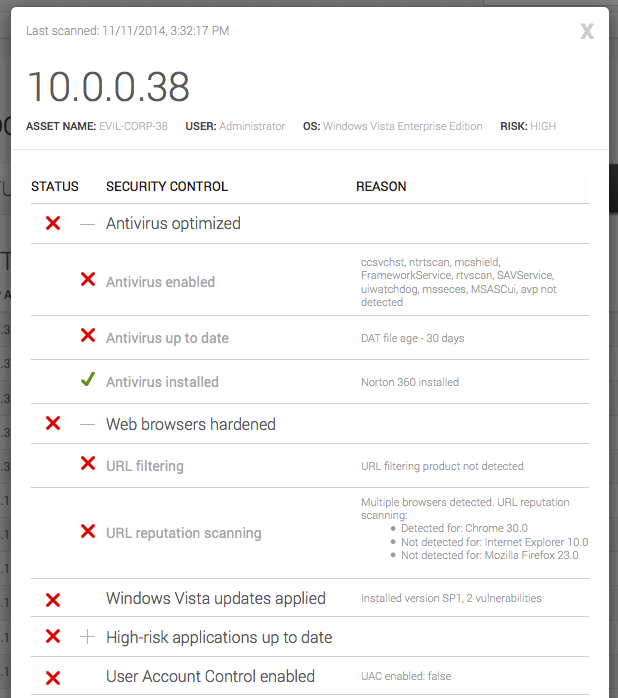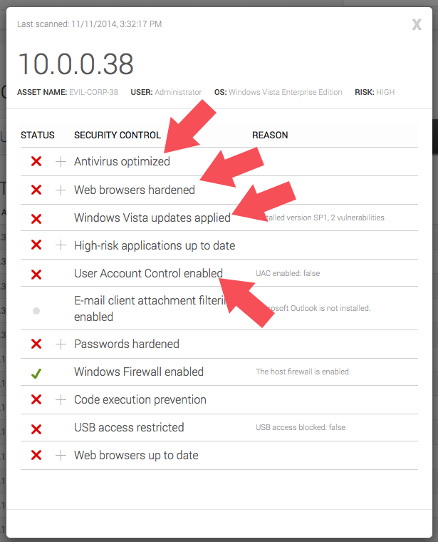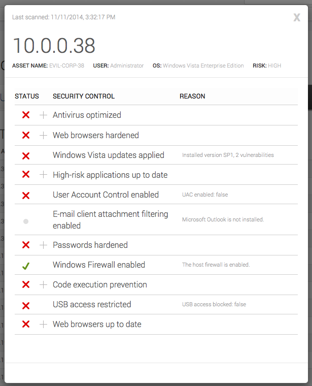 Oh no! It looks like Sally is running a high-risk system. She's one of the last people we want running a high-risk system, so let's do something about it. While we might want to have a sit-down with Sally about her choice of operating system, our first order of business is to make sure Sally is as well-protected as possible while she goes about her work. Let's click on the asset to find out what we can do to help.