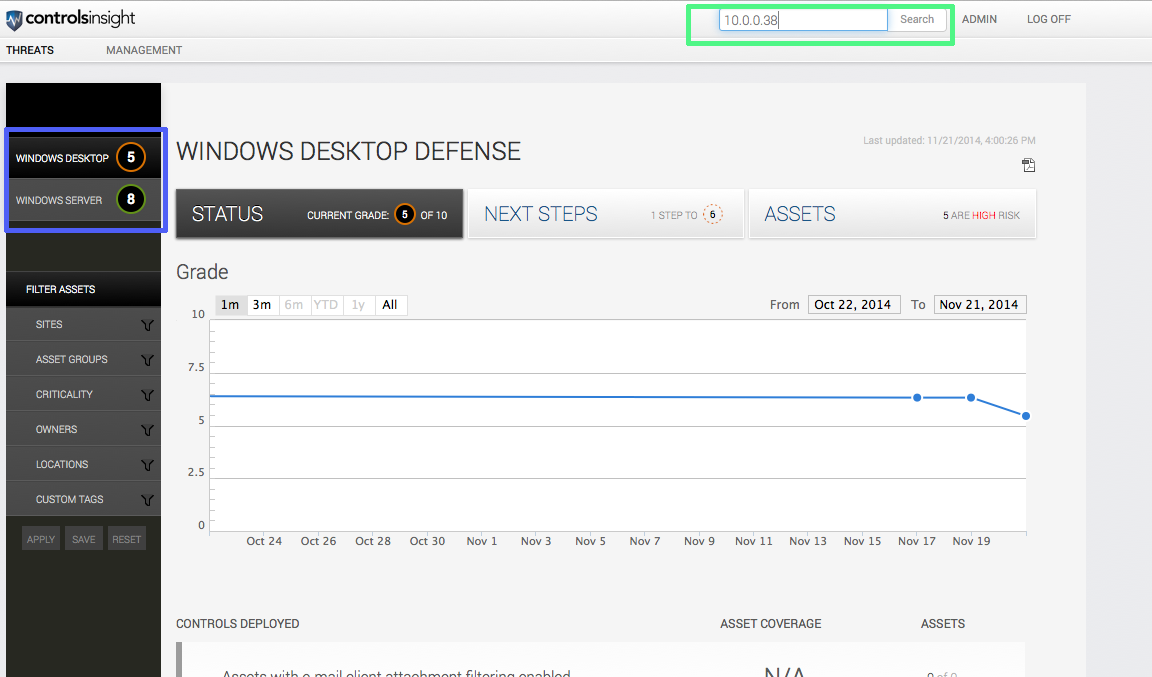 The asset filtering feature in ControlsInsight, based on Rapid7 RealContext, is one way to track the status of controls for groups of assets that have been tagged as critical. But what about a scenario when you want to verify the configuration of controls for a particular asset? While the Assets tab lists all assets being assessed, if you know the IP address or host name of the asset you'd like to analyze, the search functionality in ControlsInsight will quickly get you the information you need.