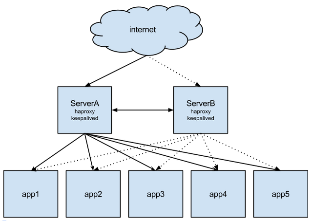 In a failure scenario where ServerA becomes unresponsive (i.e HAProxy process hangs, server dies etc.) ServerB will be unable to contact serverA. Therefore, ServerA enters a FAULT mode and ServerB becomes master. When ServerB becomes master it runs a script which will basically disassociate the Elastic IP from ServerA and assign it to ServerB. ServerB is now the only active HAProxy server and handles requests to the app servers.