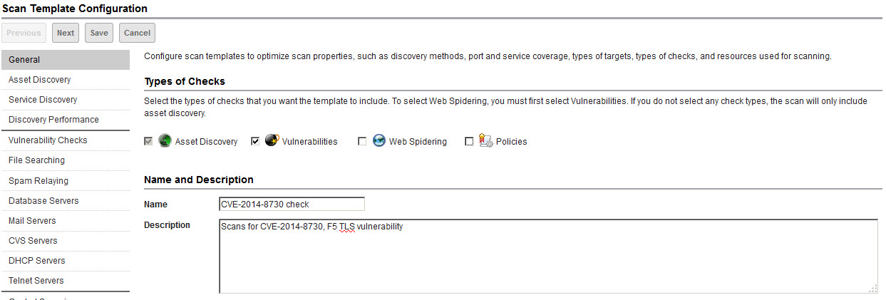 - Edit the scan template name and description so you will be able to recognize later that the template is customized for CVE-2014-8730.