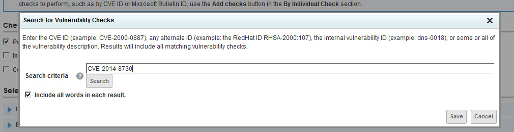 - Enter or paste CVE-2014-8730 in the Search Criteria box and click Search. Select the check box for the top row (Vulnerability Check), which will auto-select the check boxes for all types. Then click Save.
