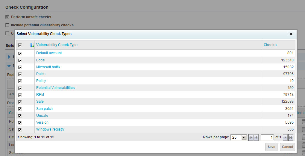 - Select the check box for the top row (Vulnerability Check Type), which will auto-select the check boxes for all types. Then click Save. Note that 0 check types are now enabled.