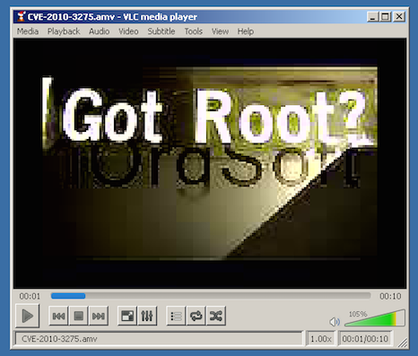 I created this time capsule in 2011 for my CVE-2010-3275 exploit, also known as "VLC AMV Dangling Pointer Vulnerability". I remember that while writing this exploit, I couldn't really find an AMV file, so I decided to grab my camera, recorded a short video, and then used a converter to convert the video format to AMV. The video has a message, but is kind of corrupt so you can't actually see it. You can hear something at least, which is meant to be a hint that there's something in the video. You will have to modify back, and I'm going to tell you how.