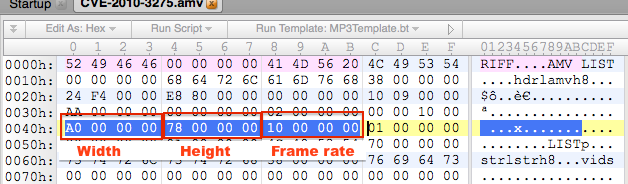 Second, you need a hex editor. My personal favorite is 010 Editor, but use whatever you want. Open the AMV file, and then at the 0x40th byte, you will see this DWORD 0xA0 0xA0 0x00 0x00. This is actually the resolution width of the video, which is the mangled portion that caused the vulnerability. Change the second 0xA0 back to 0x00, which translates to 160 in decimal, like the following screenshot: