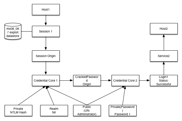 In this example we compromise a machine with the ms08_067 exploit, and get a Meterpreter Session. That Session has an Mdm::session record saved to the database. That Session record includes what exploit was used to open it, and the datastore options that were selected for that particular run. Once we have the session we run the Hashdump post module and get some NTLM Hashes. We get one for the local Administrator account. We create the Public with the Username ‘Administrator', we create an NTLMHash private as well, and then create a Credential Core tying them together. When we create the Core, we also create a session Origin that says this core came from running ‘post/windows/gather/hashdump' against Mdm::Session 1. Now we run ‘auxiliary/analyze/jtr_crack_fast' which feeds those NTLM hashes into John the Ripper and successfully cracks the Administrator hash. We create a new Password object(‘Password1') and create Credential Core 2 which has that Password and uses the same Public object as Credential Core 1. Core 2 has a CrackedPaassword Origin which points back at Core1. We then take Core 2 and use it against an SMB Service on a Second host and successfully login, so we create Login1 which connects that service to Core 2 with a Successful status and a last_attempted_at timestamp of the exact time we successfully logged in.