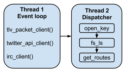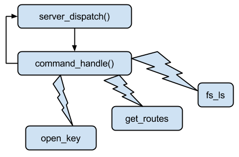 The server_dispatch function runs in a loop, receiving packets from the control socket. A 'packet' in this case is really just a header followed by a command. Each packet is passed to command_handle, which then scans a command table of strings to find a pointers to a function that knows how to parse and operate on this kind of packet. In most cases, a new thread is created by command_handle, which is passed the function pointer and the packet. The packets are then passed to the handler function, which may be built into Meterpreter or dynamically loaded as part of an extension (usually the later). While this design the listening socket from blocking while a command is dispatched, it means that a post module like windows/gather/enum_services translates into hundreds of threads spawned within Meterpreter. The lack of synchronization between these threads can also translate into stability problems, as a command sequence might be sent as 'open handle, close handle', but actually get executed in reverse.