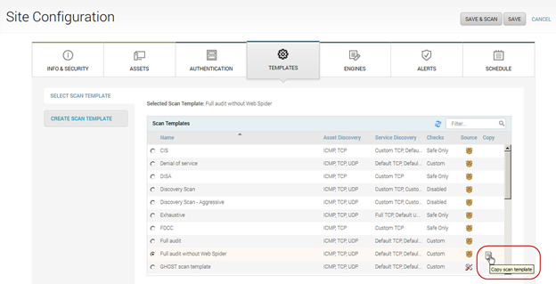 - In the Select Scan Template section, find the Full audit without Web Spider template, hover the mouse in the Copy column, and select the Copy icon.