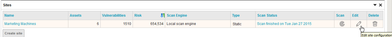 - In the Web interface in the Sites section, click Edit to open the site configuration for the site you want to scan.