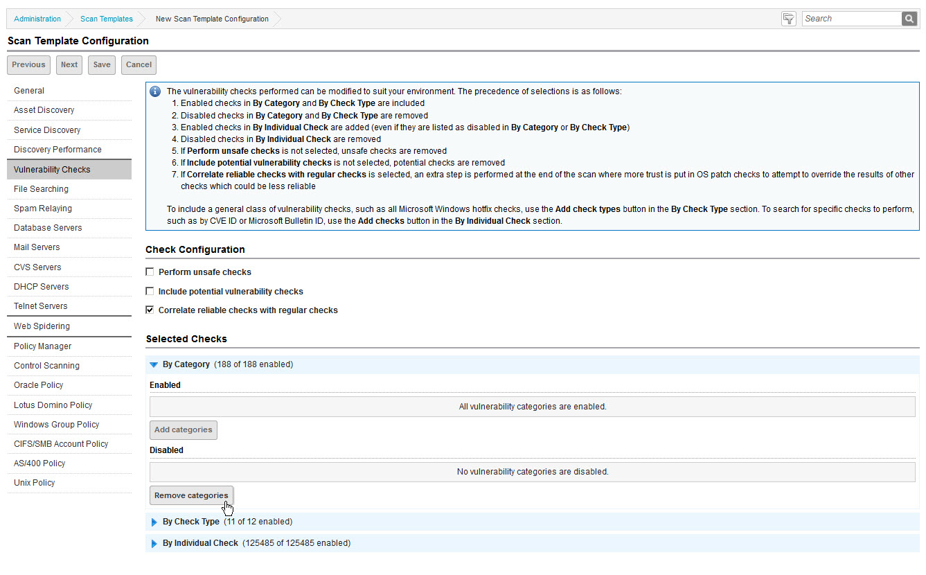- Select the check box for the top row (Vulnerability Category), which will auto-select the check boxes for all categories. Then click Save. Note that 0 categories are now enabled.