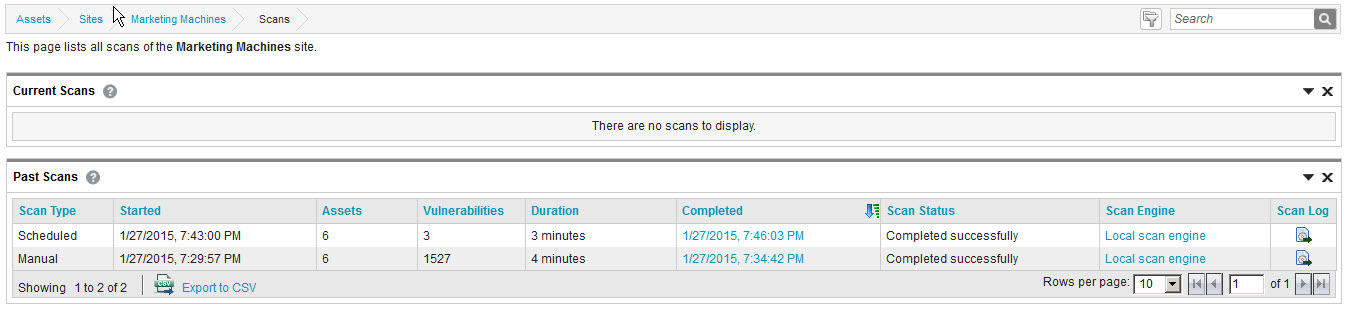 Once your scan has run, you will see the results of all scans in the scan history for the site. The vulnerabilities and risk score for each asset will reflect the most recent check for a given vulnerability, giving you a thorough picture of your risk based on this specific scan and your historical scans of that site.