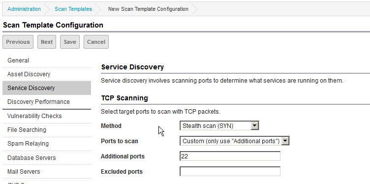 - Limit service discovery to port 22: In the Service Discovery section, set Ports to scan to Custom (only use “Additional ports”) and specify 22 for Additional ports.