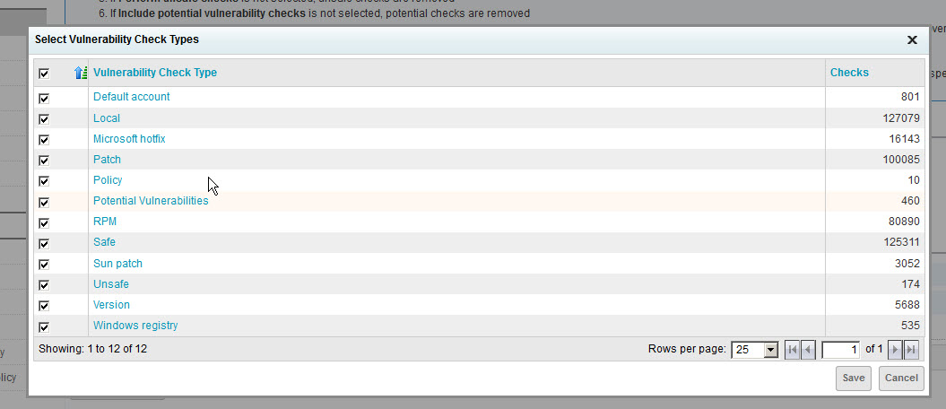 - Select the check box for the top row (Vulnerability Check Type), which will auto-select the check boxes for all types. Then click Save. Note that 0 check types are now enabled.