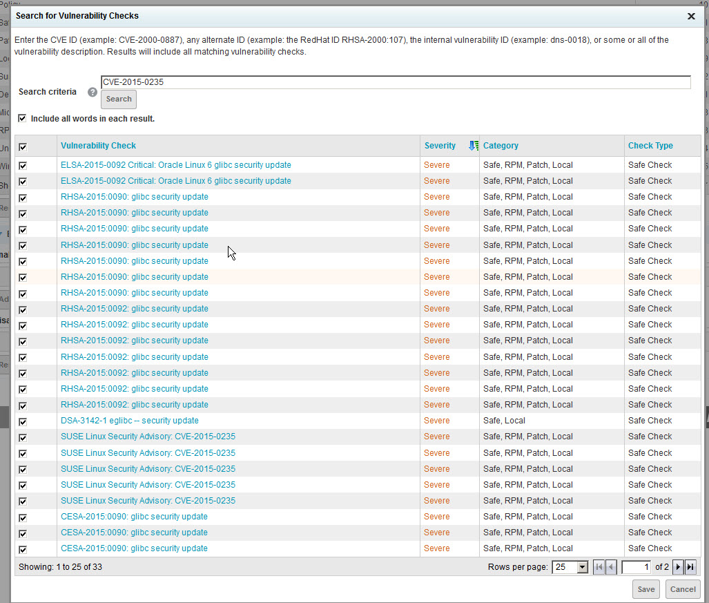 - Enter or paste CVE-2015-0235 in the Search Criteria box and click Search. Select the check box for the top row (Vulnerability Check), which will auto-select the check boxes for all types. Then click Save.