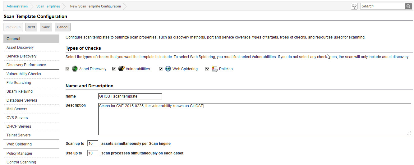 As of the Nexpose 5.12.0 product update, you can scan an existing site with a different template, and still keep the data from previous scans. If you need to determine as quickly as possible whether your assets are vulnerable to GHOST, you can create a scan template that will focus your scan on CVE-2015-0235 to the exclusion of anything else. Nexpose will check only for this vulnerability with this scan, but will retain data from previous scans about whether your assets were vulnerable to other exploits.