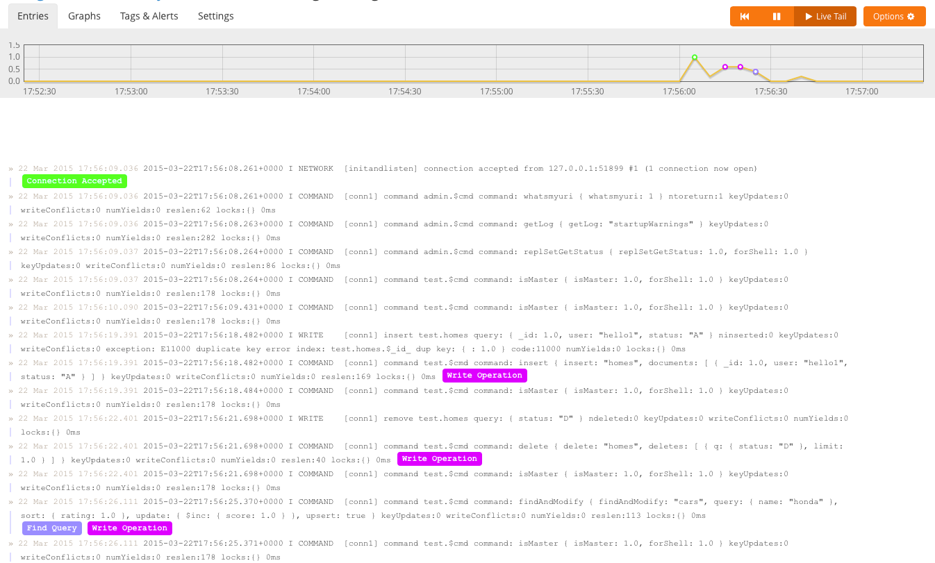 2015-03-22T15:11:25.939+0000 [conn2] command test.$cmd command: insert { insert: "cars", documents: [ { _id: 3.0, user: "mercedes", status: "A" } ] } keyUpdates:0 numYields:0 locks(micros) w:78 reslen:40 2ms`