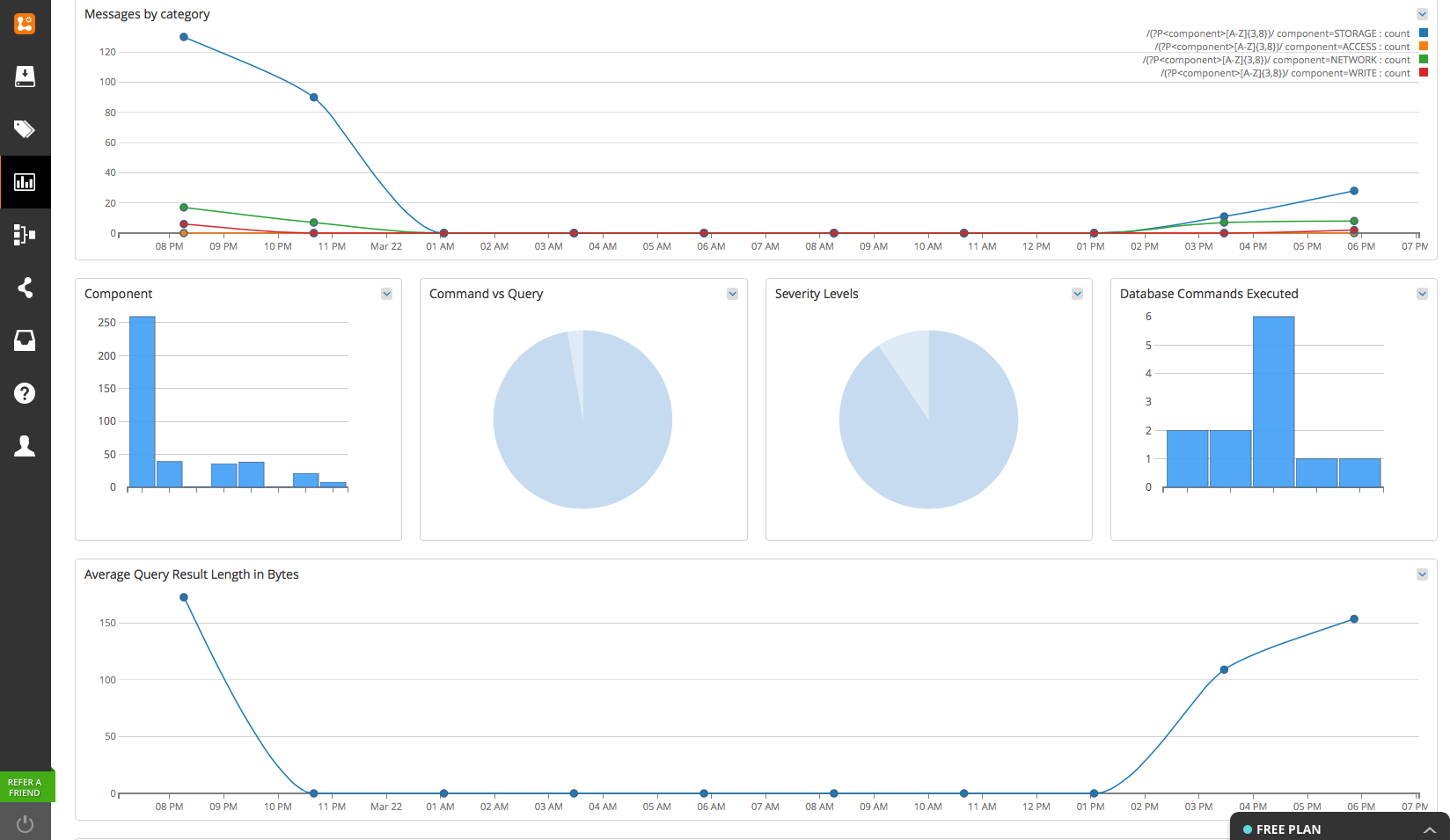 The user is able to graph the distribution of components, database commands, severity levels, average query result lengths and many more. This Community Pack takes an advantage of new fields (mentioned at the start) included in the log message.