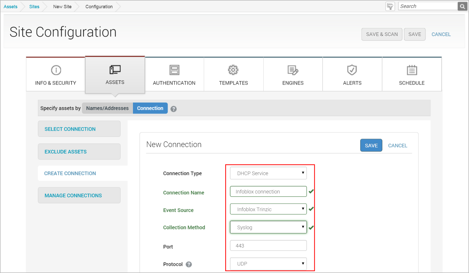 The Dynamic Discovery connection for Infoblox works by listening on a TCP or UDP port to receive syslog messages sent from the Infoblox Trinzic appliance to a Nexpose scan engine. Infoblox connections can be configured along with other Dynamic Discovery sources from the Administration page, or during the Site Configuration process, and require the designation of a port and protocol.