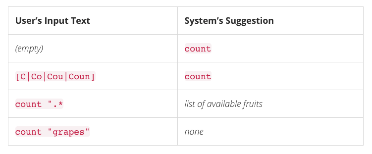 From the table above, we can see that autocomplete tries to suggest possible input based on the current parser and lexer token (more about this a bit later). Note, the list of fruits for the Fruits token would probably come from some sort of a storage, in-memory, backend, whatever it might be. While the Count token can be suggested as is.