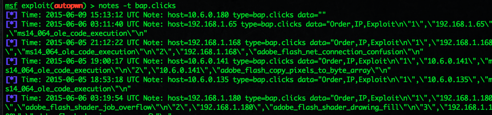 In addition, when a browser connects to BAP, this link-clicking event is also logged to the database as a "bap.clicks" note type. If the ShowExploitList option is set to true, that will also save the exploit list information so that after testing you can go back to the database and see which users are vulnerable to what exploits.