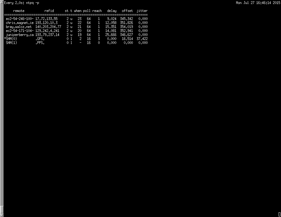 Here the GPS time source is selected as the primary time source as it has a small offset and no delay. Over time the V800 GPS module introduces jitter which is either large or not consistent with the other time servers, ntpd then flags this particular time source as being a falseticker and as a result it is not used.