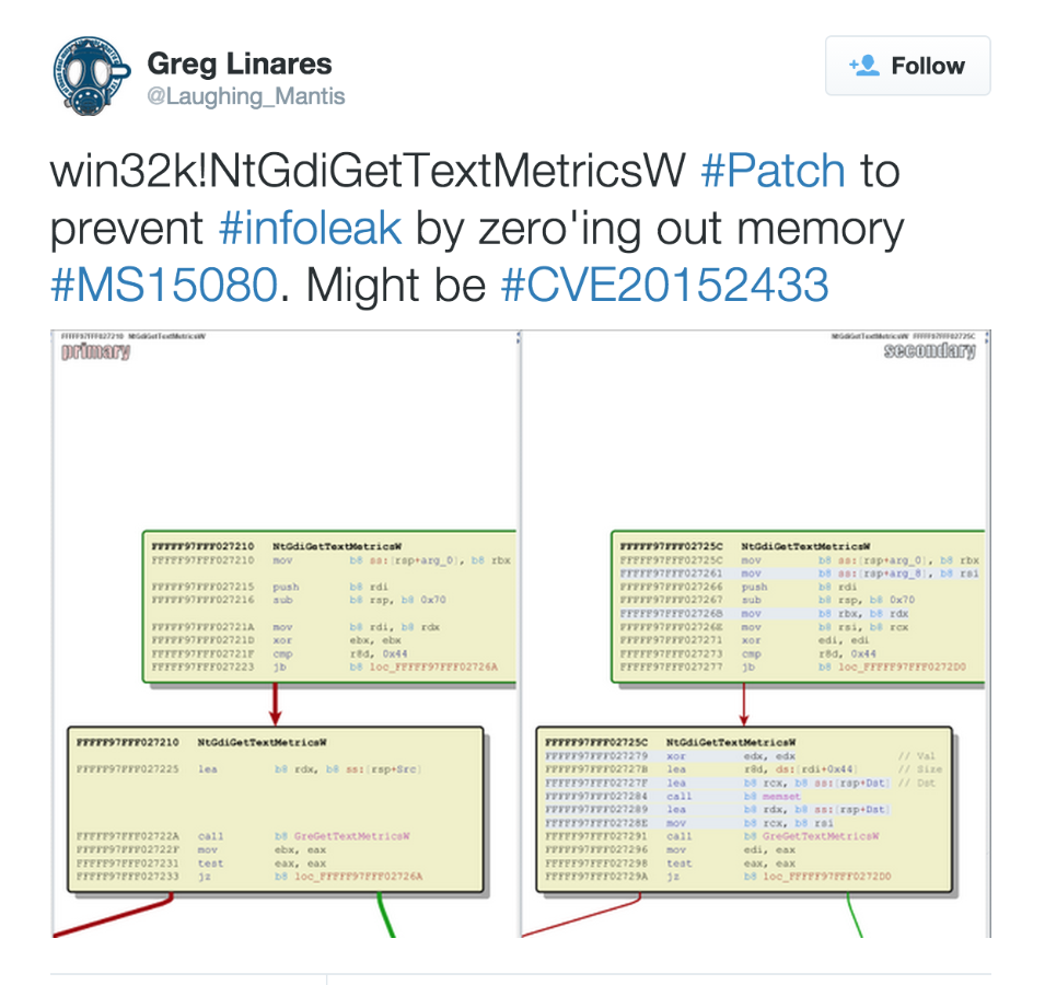 Today an interesting tweet from Greg Linares (who has been posting awesome analysis on twitter lately!) came to our attention, concerning the MS15-080 patch: