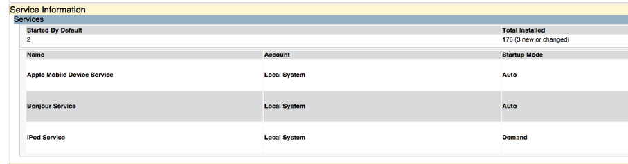 You can also see that iTunes registered multiple services, which are executed as Local System. Two of them are started automatically, and one is on demand. You can then use this information to create a GPO to deny the launch of these services, if they're not necessary to the particular use cases for this software on corporate workstations.